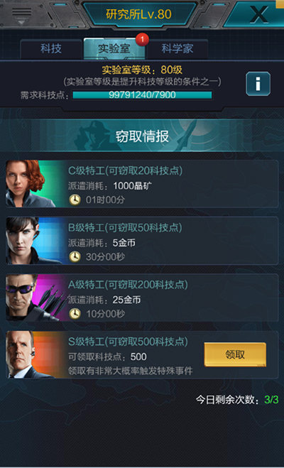 3.科技点可通过窃取情报获得,窃取情报方式有四种,分别消耗不同资源和时间。