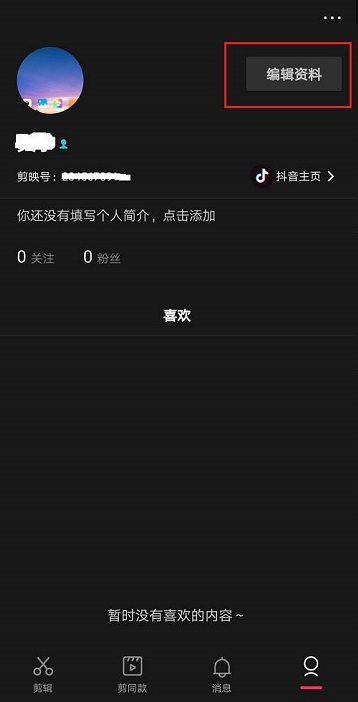 第二步:在剪映我的界面,选择编辑资料,如下图所示: