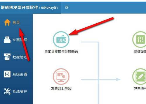 第一步:登录增值税发票开票软件税务UKey版软件,单击“首页”-“自定义货物与劳务编码”。