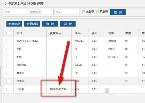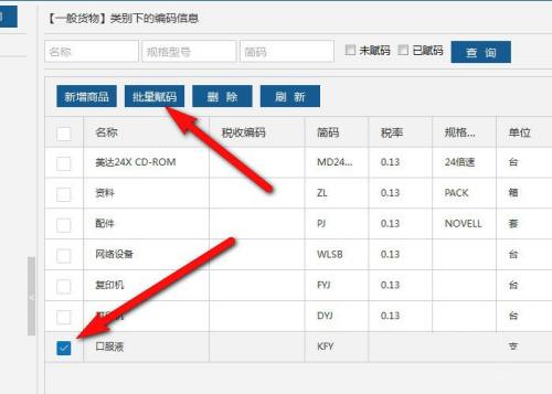 第五步:一般货物类别下,勾选商品记录,单击“批量赋码”。