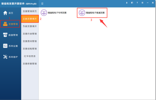第一步:进入增值税发票开票软件税务UKey版,点击发票管理-正数发票填开-增值税电子普通发票。