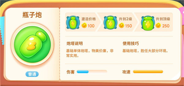 炮塔说明:持续攻击炮塔,攻击时间越长伤害越高。建造价格:200金币,升到2级320金币,升到顶级480金币。