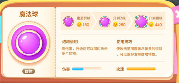 炮塔说明:用泡泡将敌人包裹并减速。建造价格:120金币,升到2级200金币,升到顶级280金币。