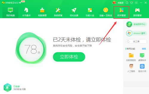 第一步:打开“360安全卫士”软件,点击首页的“软件管家”按钮。