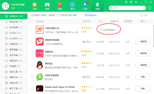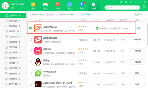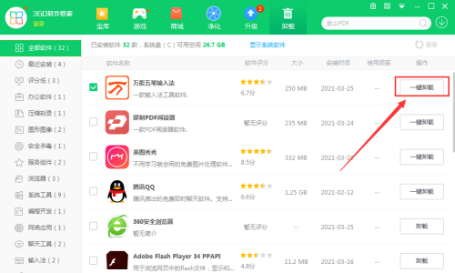 第三步:点击“万能五笔输入法”后面的“一键卸载”按钮。