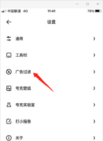 第三步:进入夸克浏览器设置界面,选择广告过滤功能。