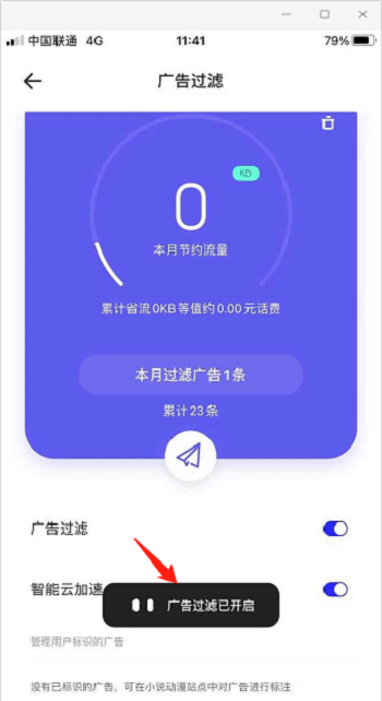 第四步:点击右侧广告过滤开启按钮,即可屏蔽广告。
