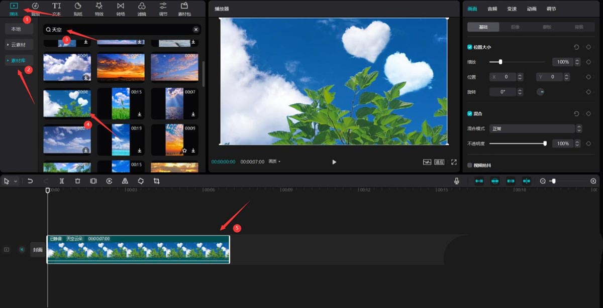 第二步:点击媒体按钮,然后点击素材库按钮,在搜索栏中输入天空两字,选择一段视频,将其添加到视频轨道中,见下图。