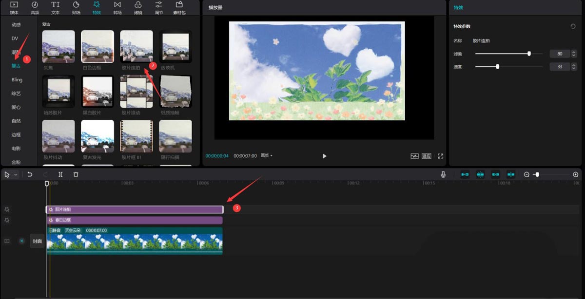 第四步:点击复古按钮,选择胶片连拍特效,将其添加到特效轨道中,见下图。