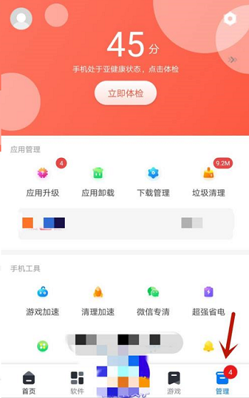 第一步:打开360手机助手,点击界面右下方管理选项(如图所示)。