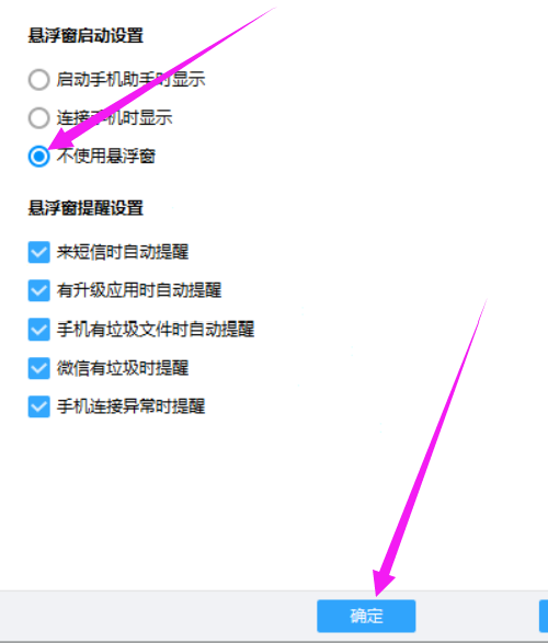 第五步:在“悬浮窗设置”版面中,选中“悬浮窗启动设置”板块下的【不使用悬浮窗】选项,单击【确定】完成。