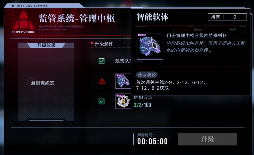 升级管理中枢需要用到智能软体,这是主线奖励材料,只有特定关卡首通会掉落。