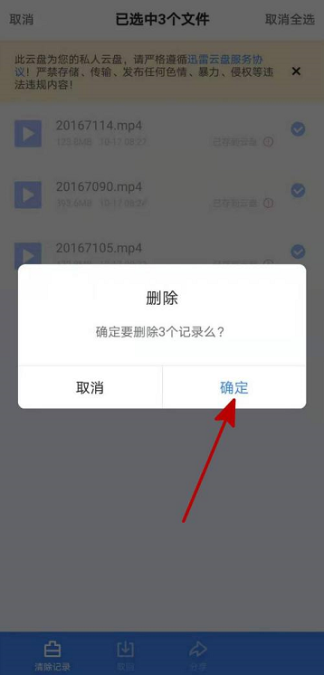 第五步:弹出提示,最后点击确定即可删除云盘记录(如图所示)。