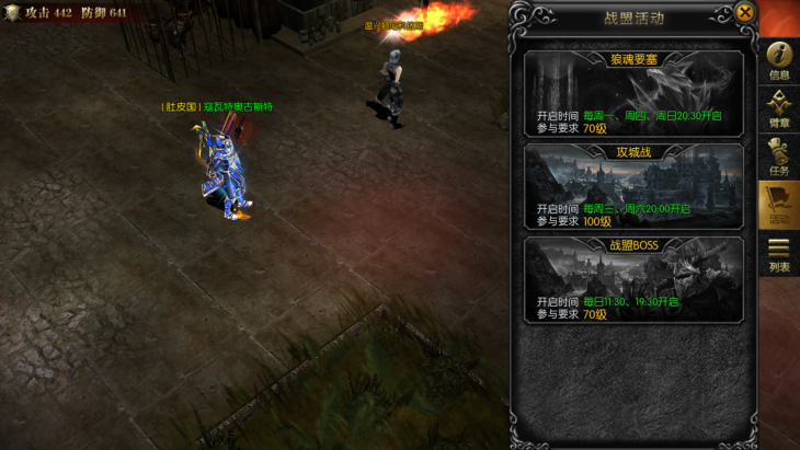 其中狼魂要塞为守塔活动,守护雕像,击杀怪物。攻城战为战盟对抗类活动。战盟BOSS为挑战BOSS活动,合力击杀BOSS,结束后还有战盟拍卖哦。