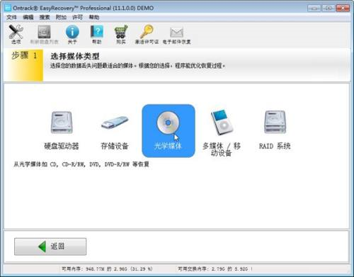 第一步:选择“光学媒体”,点击“继续”进行接下来的操作。之后就是选择好需要扫描的卷标和恢复场景。