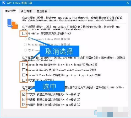 然后按下图设置。这样设置后,就断开了WPS与Office文档的默认关联。同时,用WPS创建的文件默认也保存为 docx、xlsx和pptx,这些文件可由Office打开 。