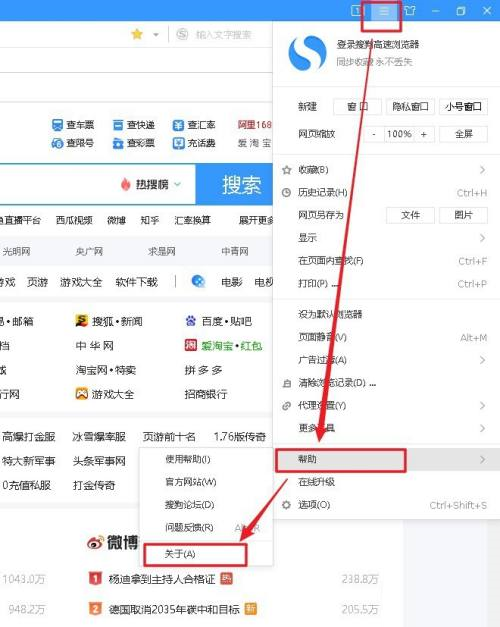 第二步:点击菜单右上方的【菜单】选项,并选择【帮助】,点击【关于】,如下图所示: