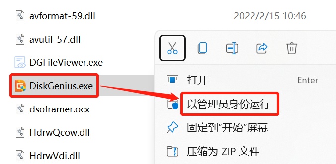 1、下载到英文路径并解压完成后,打开“DiskGenius 5.4.3”和“DiskGenius64”文件夹(32位系统的打开DiskGenius32文件夹),以管理员身份运行其内的“DiskGenius.exe”程序文件,随后按图操作即可。