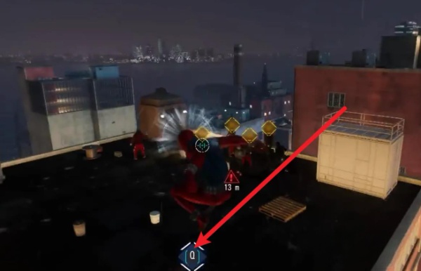 打开漫威蜘蛛侠游戏,首先长按“跳跃键”爬上墙顶。