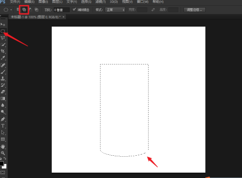 第二步:选择椭圆选择工具,在选项栏选择添加到选区按钮,然后在矩形下面点击椭圆选区,如图所示。
