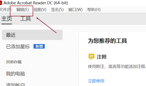 第一步:首先打开Adobe Reader,点击上方的编辑,如图: