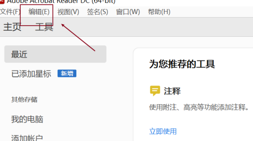第二步:打开Adobe Reader后,点击上方的编辑按钮,如图: