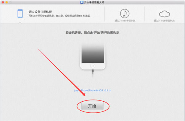 接着我们运行软件,如果界面显示“设备已连接”并且出现了设备型号,那么我们可以直接点击“开始”进入下一步恢复界面了;