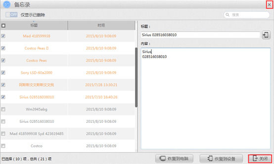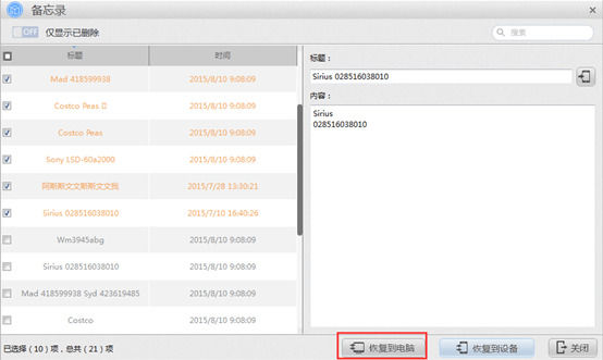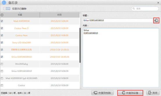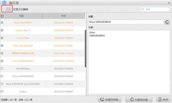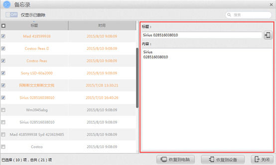 第六步:查看已删除备忘录,勾选要恢复的备忘录,在右侧可对备忘录信息进行修改。