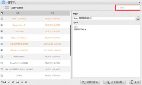 第五步:如遇记录过多,可在左上角【搜索】中输入想查找信息的关键字进行搜索。第六步:查看已删除备忘录,勾选要恢复的备忘录,在右侧可对备忘录信息进行修改。