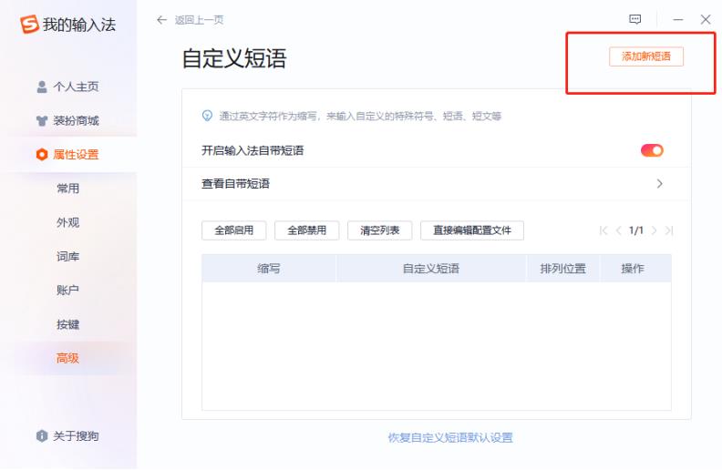 第五步:进入 “自定义短语”页面后,点击右边的“添加新短语”选项。