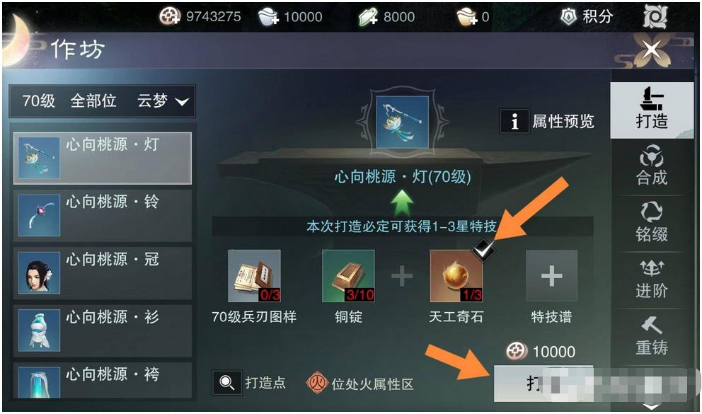 4.到达后,注意要勾选天工奇石(不勾选可以概率获得1~2星特技),准备好打造需要的材料后,就可以进行打造了,可以随机获得1~3星特技。