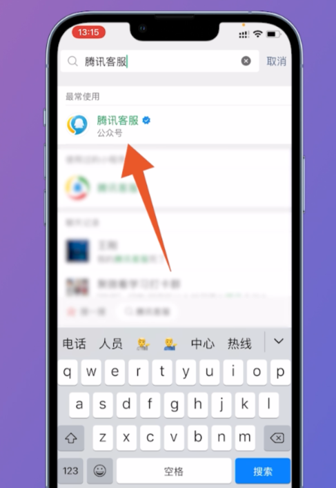 在微信的消息页面,点击上方的搜索框,输入腾讯客服,点击下方的客服公众号。
