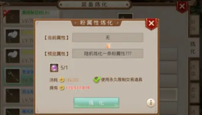 粉装备炼化,需要60级以上的蓝色装备、3块金色炼化材料和1块粉水晶。