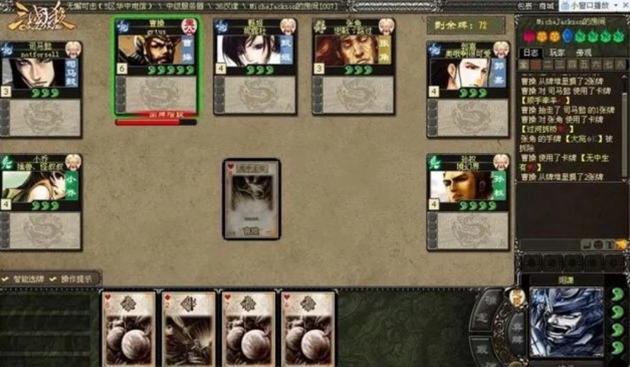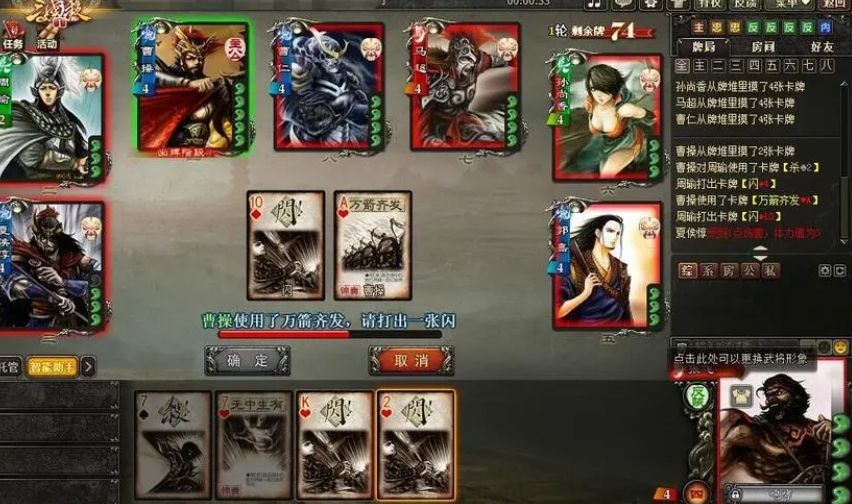玩家获得系统随机发放的卡牌后,通过卡牌的运用来判断胜负。卡牌主要分为锦囊、杀、闪以及血量回复等几种类型。