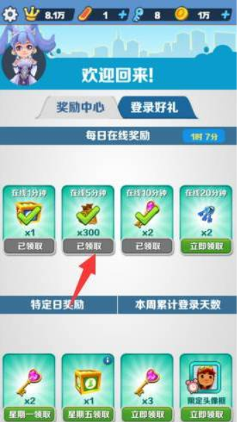 3、在左侧的福利中心,每天完成在线时间要求后也可以领取钥匙。