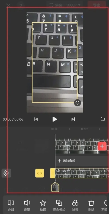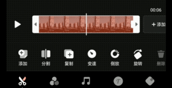 剪切视频功能:选中片段,拖动滑块两边的白色把手,即可剪切不要的画面。点击“分割”,把一大段的视频分割成多段视频,选种不需要的片段并删除。