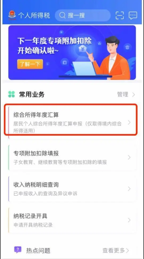 2、进入个人所得税app后,进入首页的年度汇算页面,在首页的“常用业务”里面找到“综合所得年度汇算”选项,点击进入;