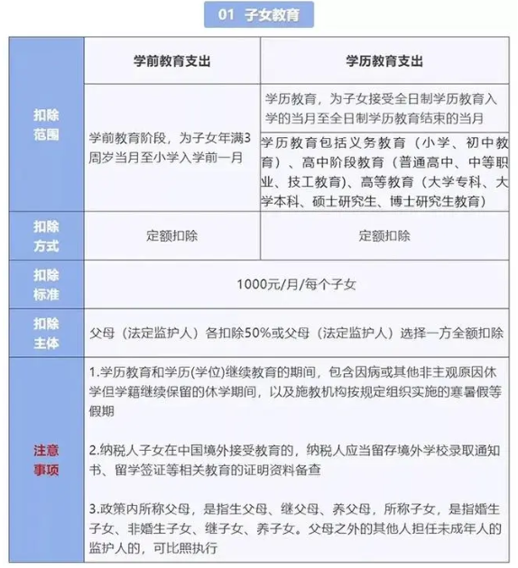 1、子女教育专项扣除,纳税人子女在学前或接受全日制学历教育费用时,可按每月1000元扣除;