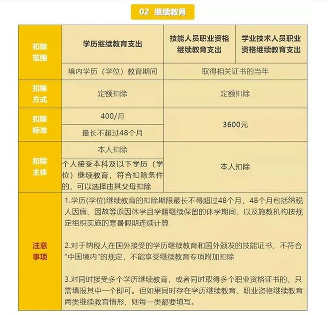 2、继续教育专项扣除,纳税人在中国境内接受继续教育,按每月400元扣除,同一学历扣除不得超过48个月;
