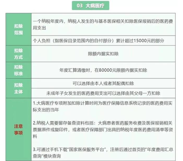 3、大病医疗专项扣除,在一年内,与医疗保险有关的医疗费用超过15000元的部分,汇算时扣除,限额为8万元;