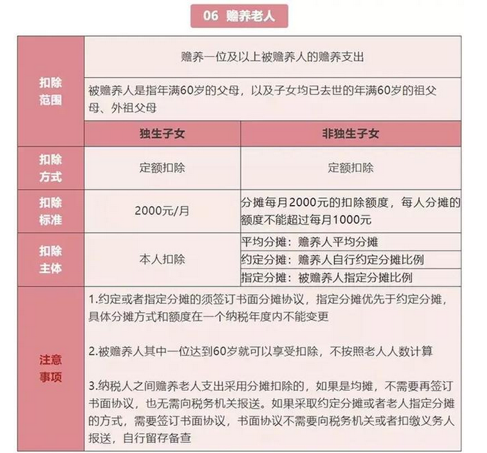6、赡养老人专项扣除,独生子女每月扣除2000元,非独生子女和其他兄弟姐妹分摊扣除2000元,每人分摊金额不得超过1000元。
