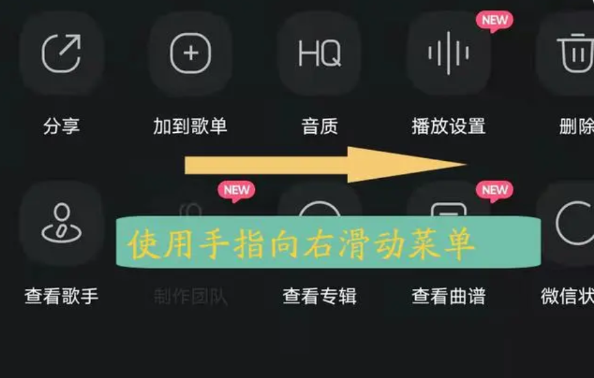 选择“两个点”以后,会弹出一个菜单,然后按照图中箭头所指的方向(向右)滑动菜单。如下图: