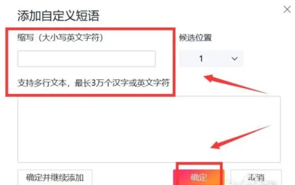 在弹出的添加自定义短语的窗口中,输入您想要设置的短语内容。