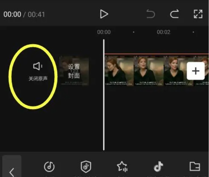 2、在剪辑界面,找到并点击“关闭原声”选项即可。