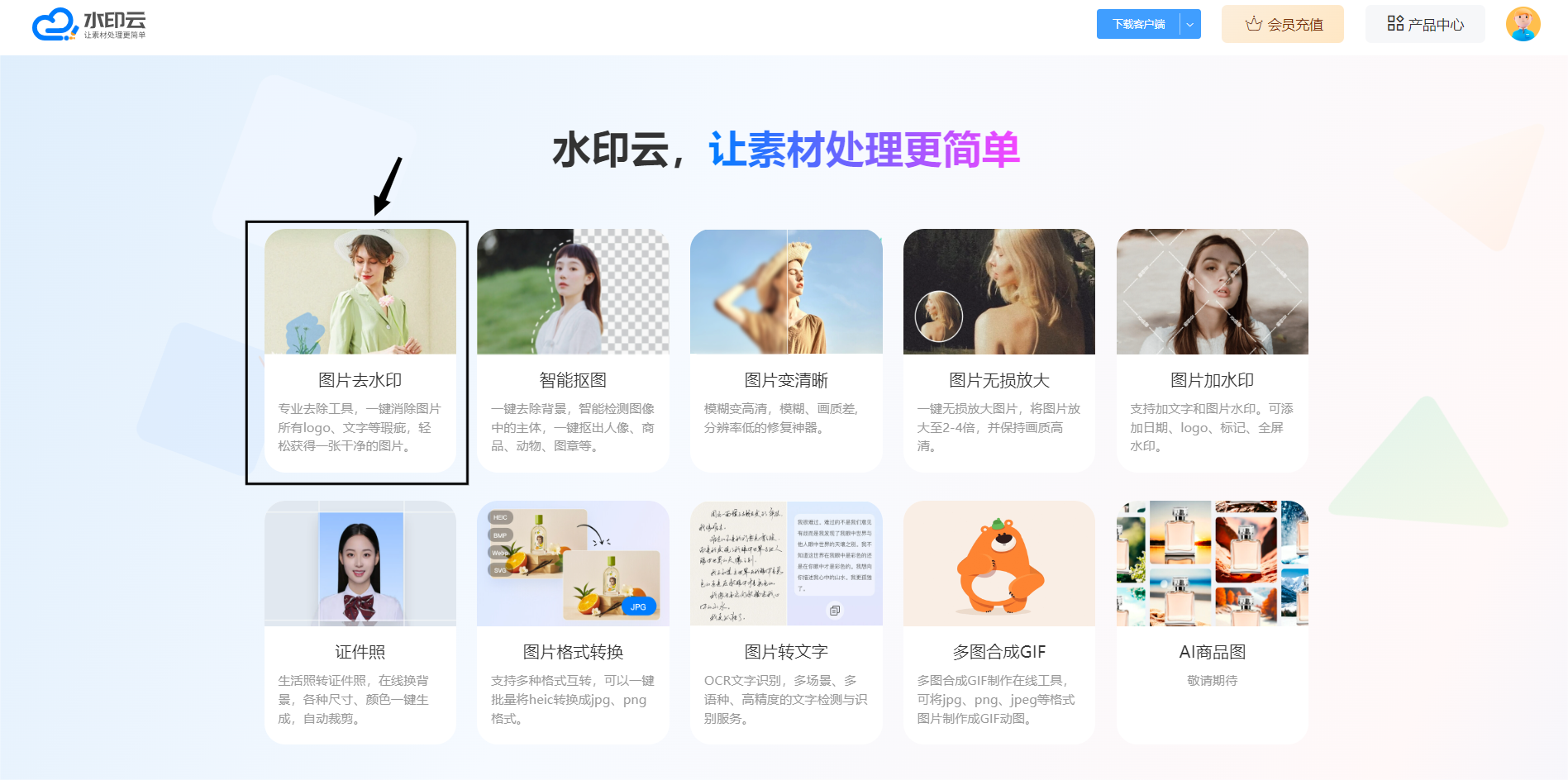 水印云是专注多媒体内容处理的专业去水印软件,核心主打图片与视频高效去水印功能,依托智能填充技术,去除水印...