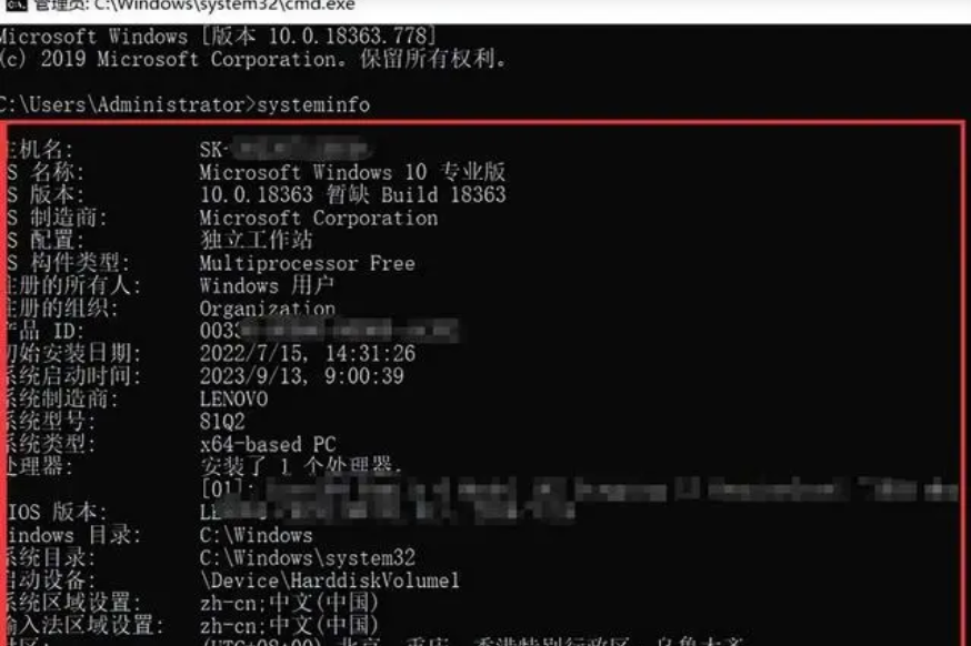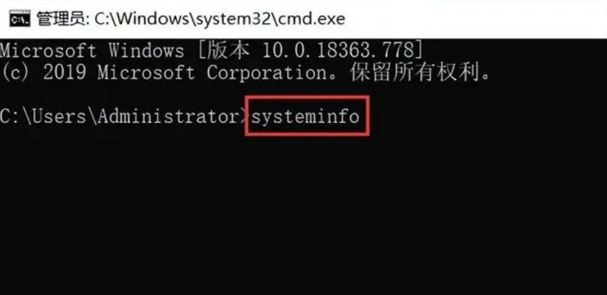 步骤2:在打开的管理员窗口输入命令【systeminfo】,并按【Enter】键。