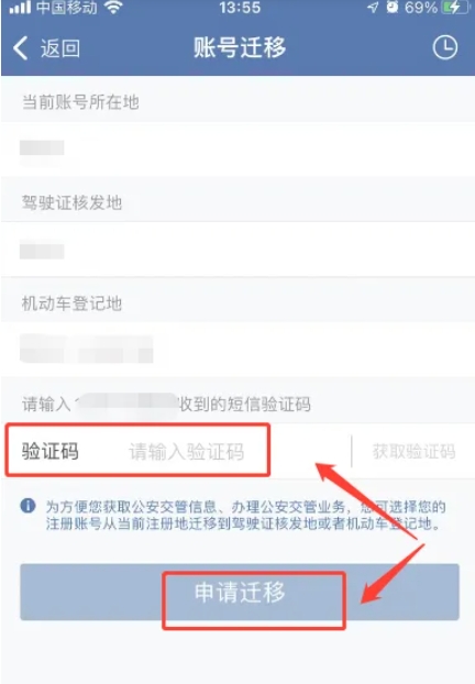 3、在账号迁移页面,选择迁入地,并输入验证码,然后点击“申请迁移”,等待审核结果即可。