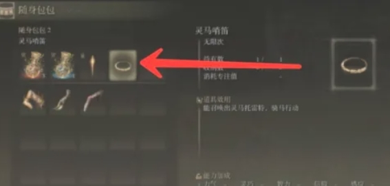 在随身包包中,找到灵马哨笛并将其装备到可用的栏位上。随身包包的栏位有限,通常只有六格,因此请确保将重要的装备放置在易于访问的位置。