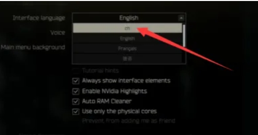 点击“Interface language”选项旁边的下拉菜单,从中选择“简体中文”或“Chinese Simplified”(具体选项可能因游戏版本而异)。注意,有些版本可能直接显示“中文”或“Chinese”。
