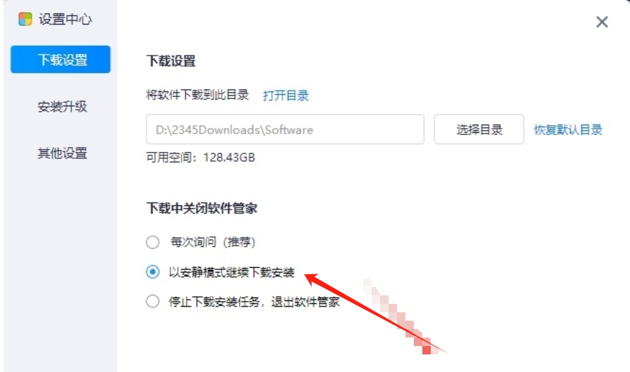 2、点击“下载设置”选项,然后在“下载设置”窗口中,勾选“以安静模式继续下载安装”选项,然后点击“确定”即可。